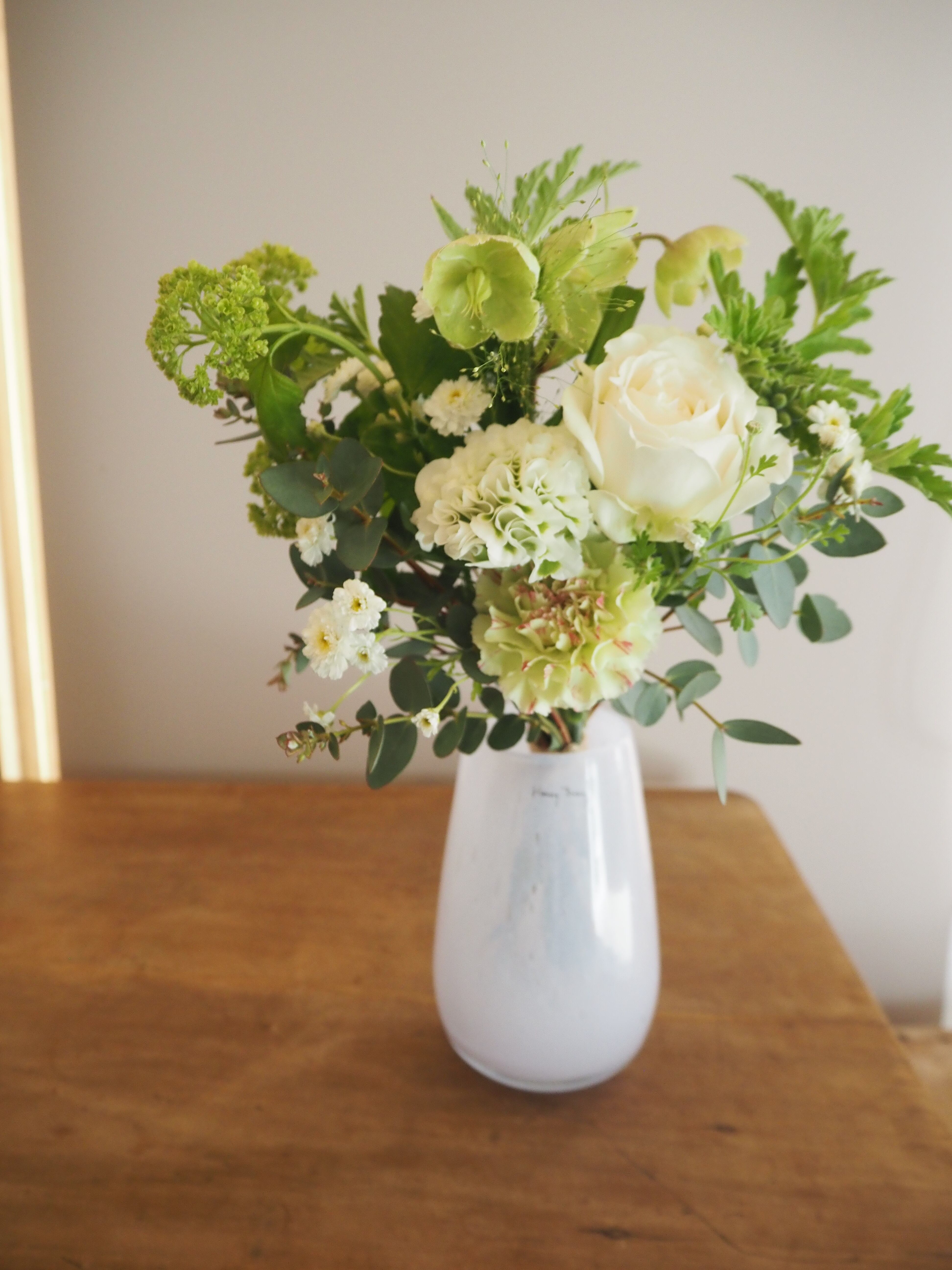 花束はグリーンをたっぷり使用し、